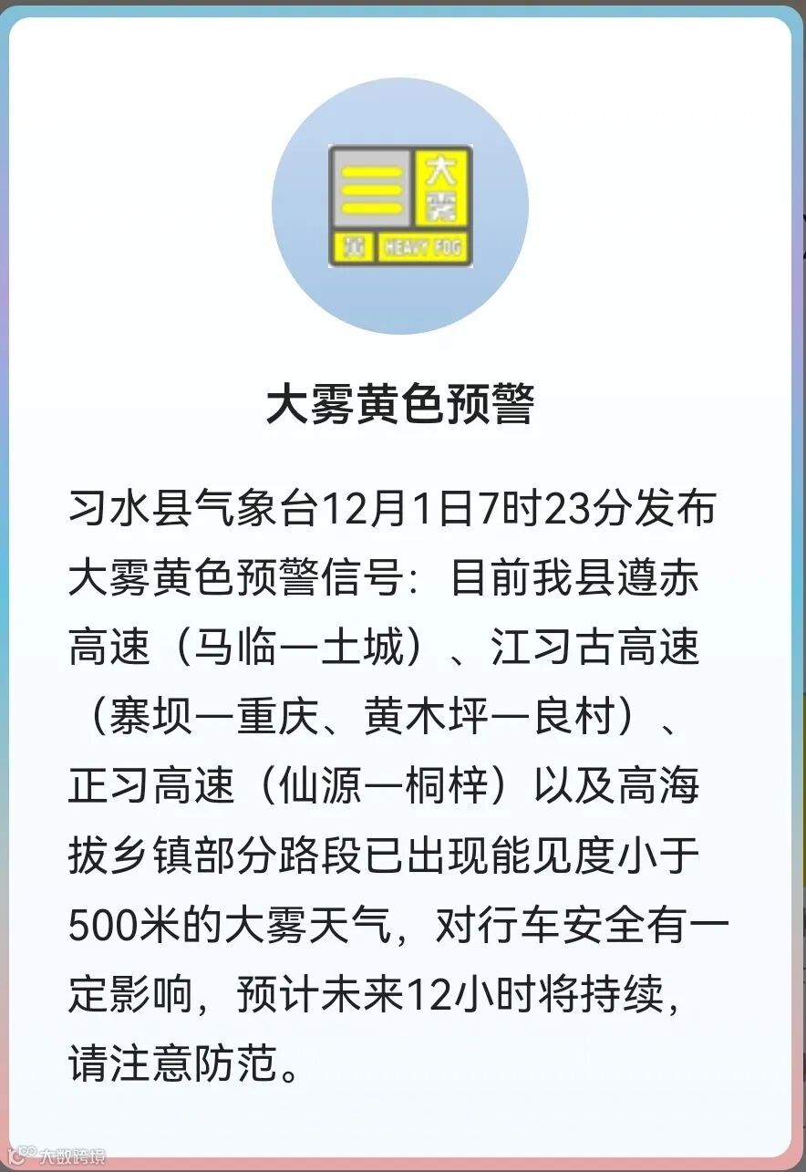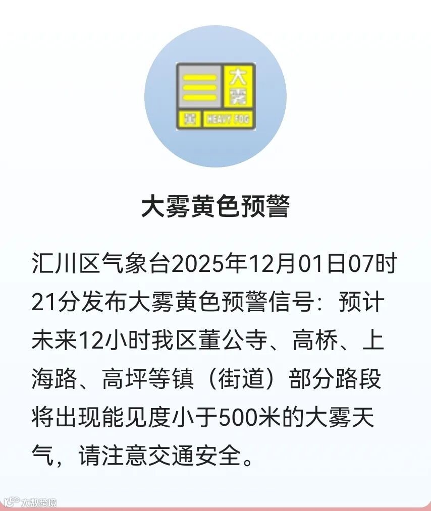 也发布了大雾黄色预警信号