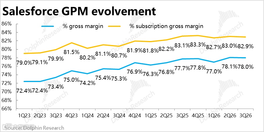 订阅业务毛利率为82.9%,同比、环比均下滑,终结自2021财年以来持续上升趋势,主因AI服务成本更高且8月提价未能完全对冲。专业服务毛亏损率扩大至-10.7%。受高毛利订阅业务占比提升影响,公司整体毛利率达78%,同比微升但环比回落。