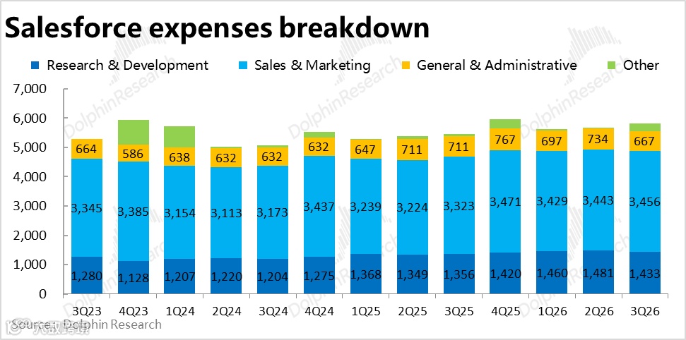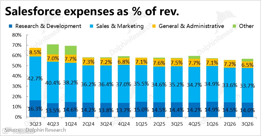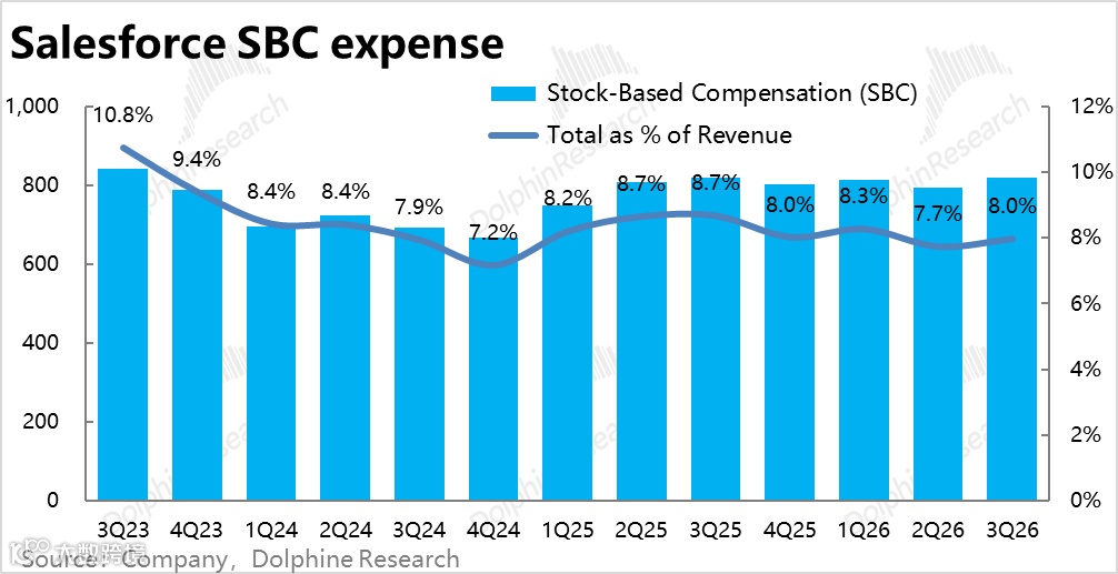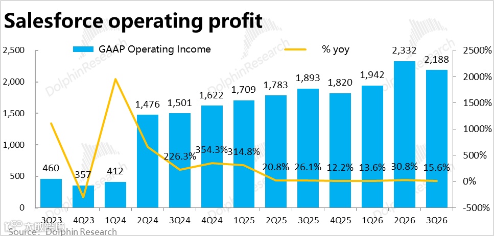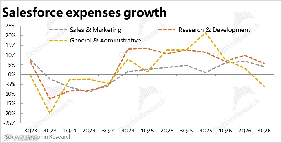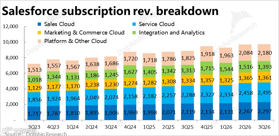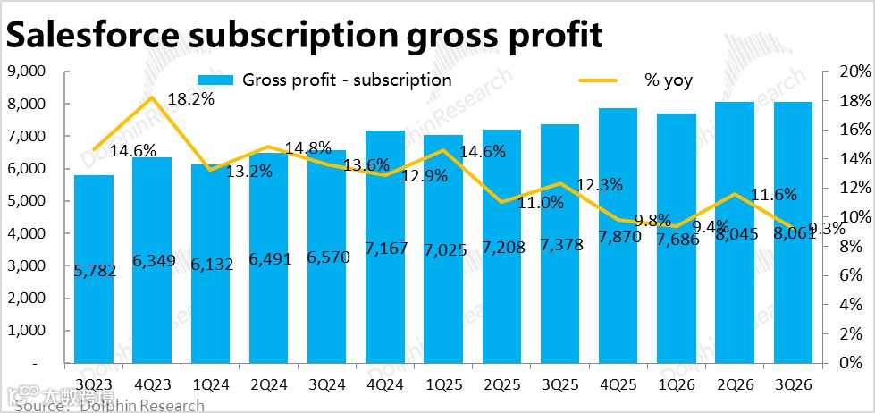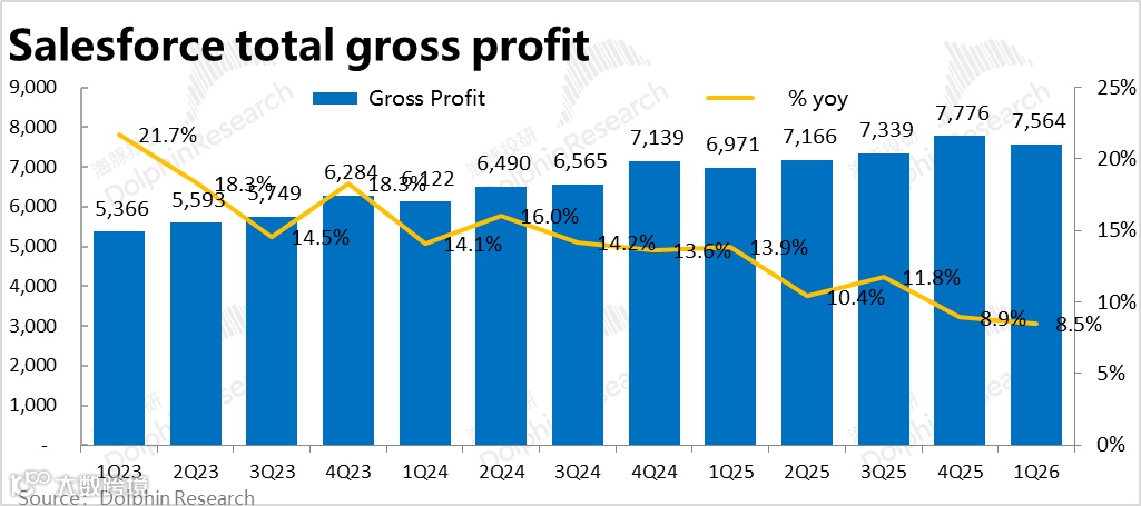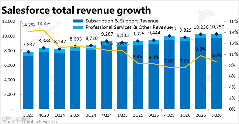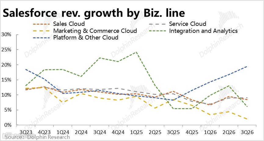 传统业务则普遍走弱:销售云增长8.4%(放缓约1个百分点),营销与商业云仅增2%(放缓2个百分点),数据分析业务(MuleSoft+Tableau)增长6%,显著放缓。专业服务收入同比下滑5.7%,延续疲态。