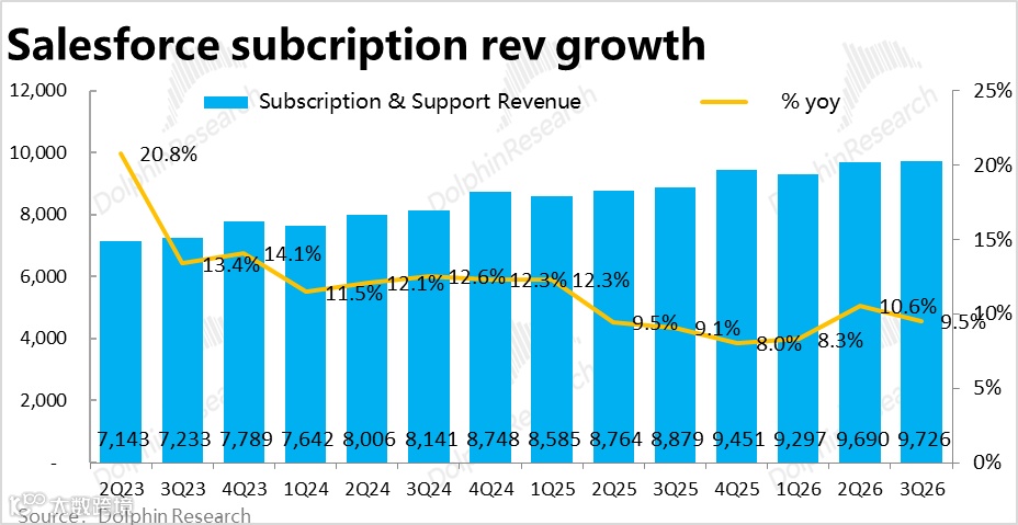 美国SaaS龙头Salesforce于2025年12月4日美股盘后发布2026财年第三季度财报(截至10月31日)。当季总营收约102.6亿美元,同比增长8.6%(剔除汇率影响为8%),略低于市场预期;核心订阅收入97.3亿美元,同比增长9.5%,增速连续两季放缓。