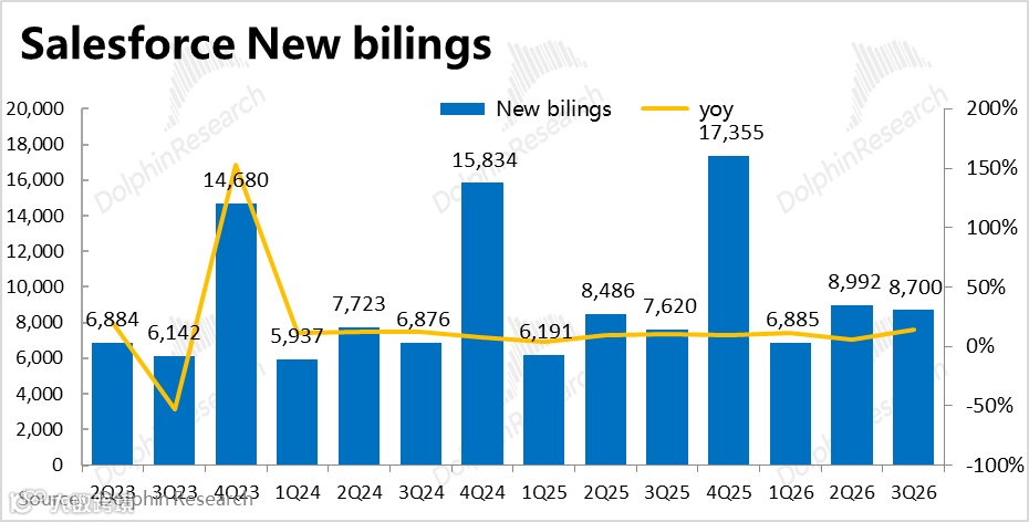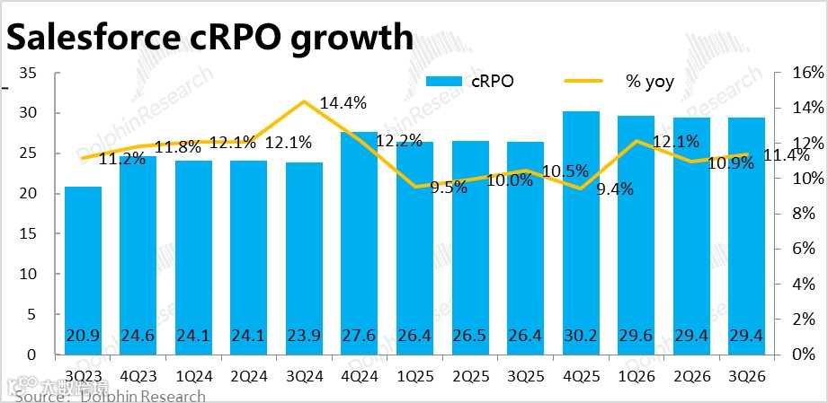 cRPO(短期未履约余额)同比增速达11.4%,较上季提升0.5个百分点;新签合同金额8700万美元,同比增长14%。但需注意:cRPO余额294亿美元与上季持平,新签合同额环比略降,当前改善主要受益于低基数效应,尚未形成实质性拐点。