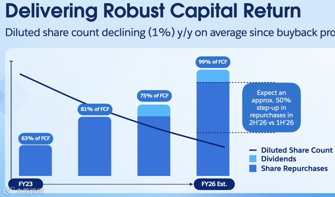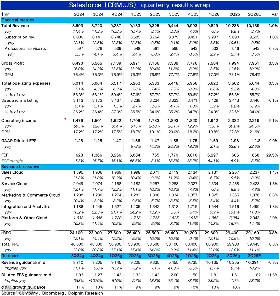 Salesforce本季业绩整体不及预期,收入增长持续放缓、毛利率首次环比转跌,印证市场对其“增长疲软”的核心担忧。但AI相关业务(服务云、平台云)已展现结构性韧性,cRPO与新签合同等领先指标边际回暖,叠加管理层明确的AI投入节奏与股东回报承诺(2026财年拟返还约140亿美元自由现金流),为后续增长企稳提供支撑。
