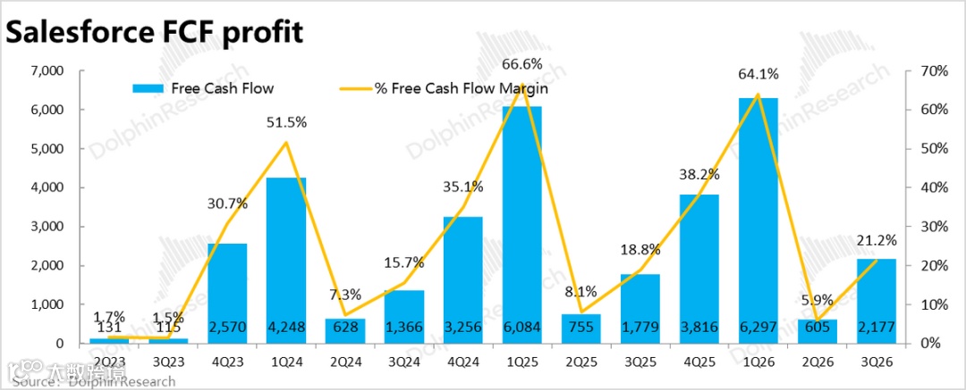 自由现金流21.8亿美元,现金流利润率21%,与经营利润基本持平,略低于市场预期的22%。
