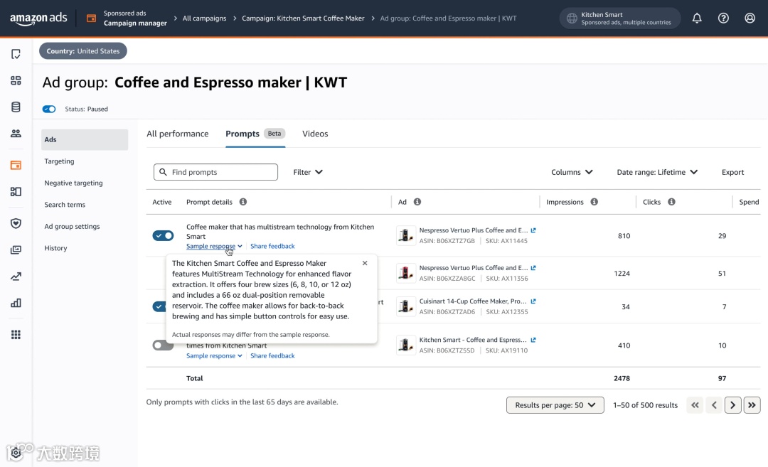 已接入的卖家可通过广告后台路径“广告活动 → 广告 → 提示词”查看数据,包括获得点击的提示词内容、关联广告及关键效果指标。