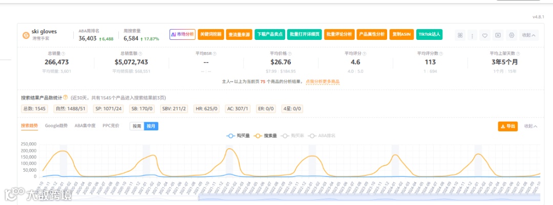 通过卖家精灵数据可见:关键词“Ski gloves”(滑雪手套)搜索量自9月起显著攀升,10–2月达全年峰值;“Heated foot pad”(加热脚垫)同样在10月起进入流量上升通道——季节性需求真实存在,且提前释放。