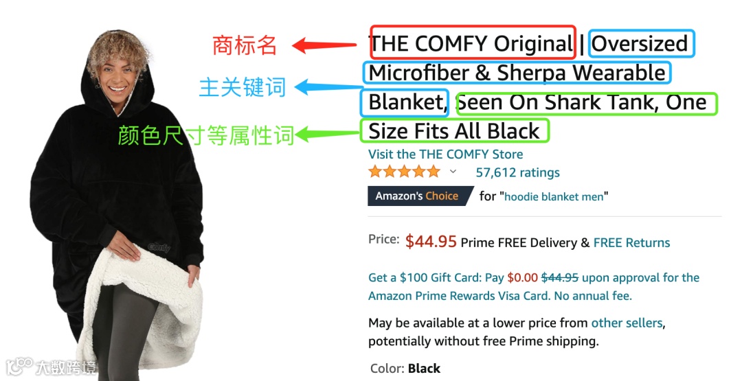 标题结构建议:品牌名 + 核心关键词 + 特性/功能/属性词。其中核心关键词必须使用类目最大流量词(如“wearable blanket”“blanket hoodie”),可通过卖家精灵反查头部ASIN所用词确认。