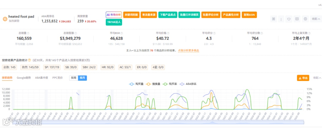 - 案例:将固定式大型加热脚垫升级为“可折叠便携款”,支持USB充电+三档控温,主关键词“heated foot pad”月搜索量超300万,延伸词“portable heated foot pad”达80万;某款售价29.99美元产品月销超8000单,月销售额约24万美元。