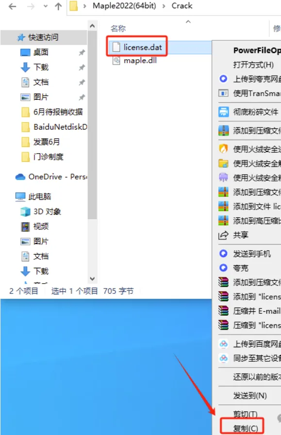 18.回到步骤13打开的【Crack】文件夹,鼠标右击【license.dat】选择【复制】。