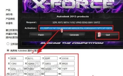 16.生成激活码:①使用快捷键“Ctrl+C”复制【申请号】后的代码;②使用快捷键“Ctrl+V”将代码粘贴到【Request】后的框中;③点击【Patch】;④点击【确定】;⑤点击【Generate】生成激活码。