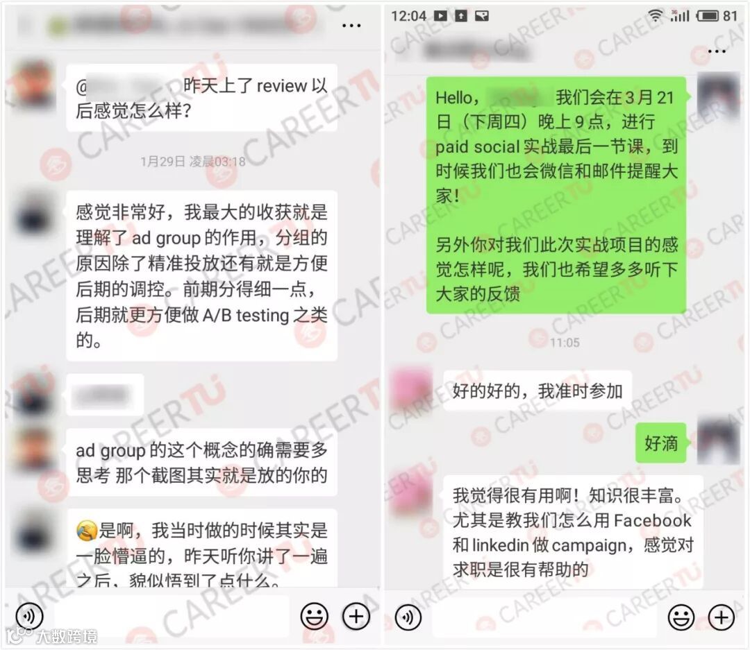 毕业后将有机会加入职图精英校友群,与中美6000+导师及校友共同进步。线上将会发送行业干货,分享最新职位需求,与同、往期校友互相学习及分享。除此之外,还能参加职图定期举办的线下活动、可与同学及导师面对面沟通,快速拓展人脉圈,获取更多业界资讯!