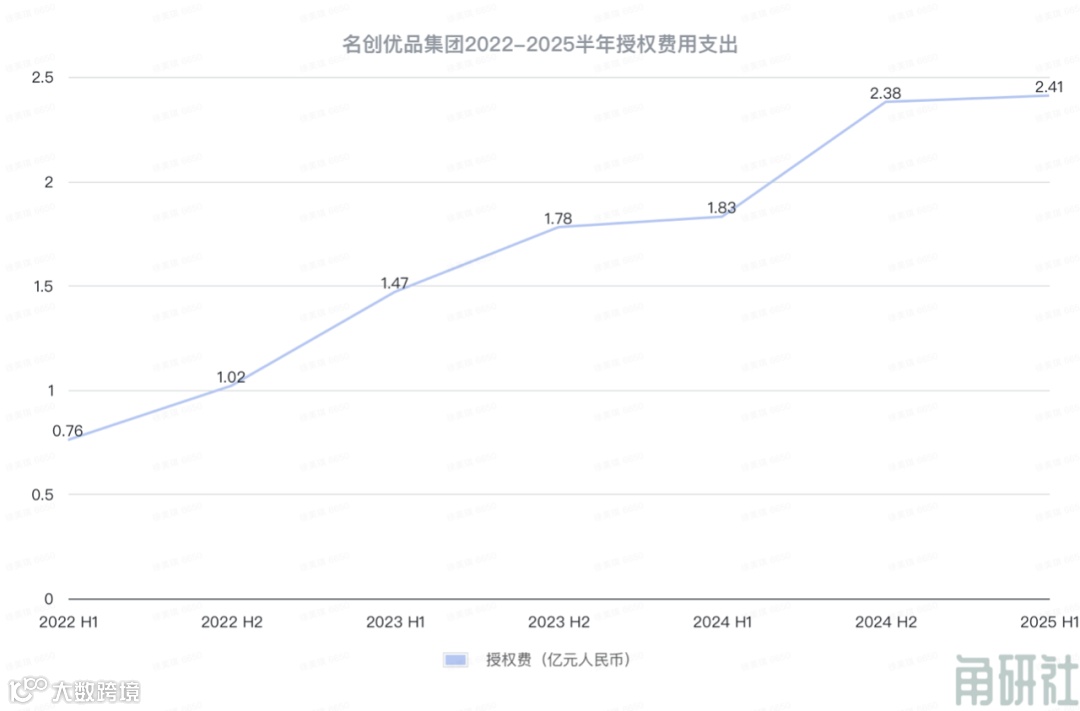 依托大IP的二创产品销售,TOP TOY实现了半年收入同比增长73%至7.21亿元,同样的,也要每年对外支出大笔授权费用用以购买IP。今年上半年,名创优品集团支出的授权费用就达到2.41亿元,再创新高。近三年的授权费用支出也在增长,2022年支出1.78亿元、2023年支出3.25亿元、2024年支出4.21亿元,其中就包括了TOP TOY向外购买IP的费用。