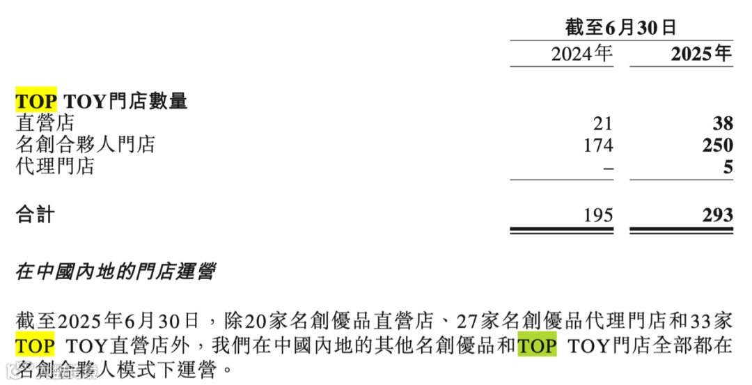 在TOP TOY的293家店铺中,有38家直营店,250家合伙人门店以及今年新开设的5家代理门店。其中有5家直营门店、5家代理门店都位于海外。而中国内地大部分TOP TOY门店都在名创合伙人的模式下运营,报告期内合伙人人数已达到70位。