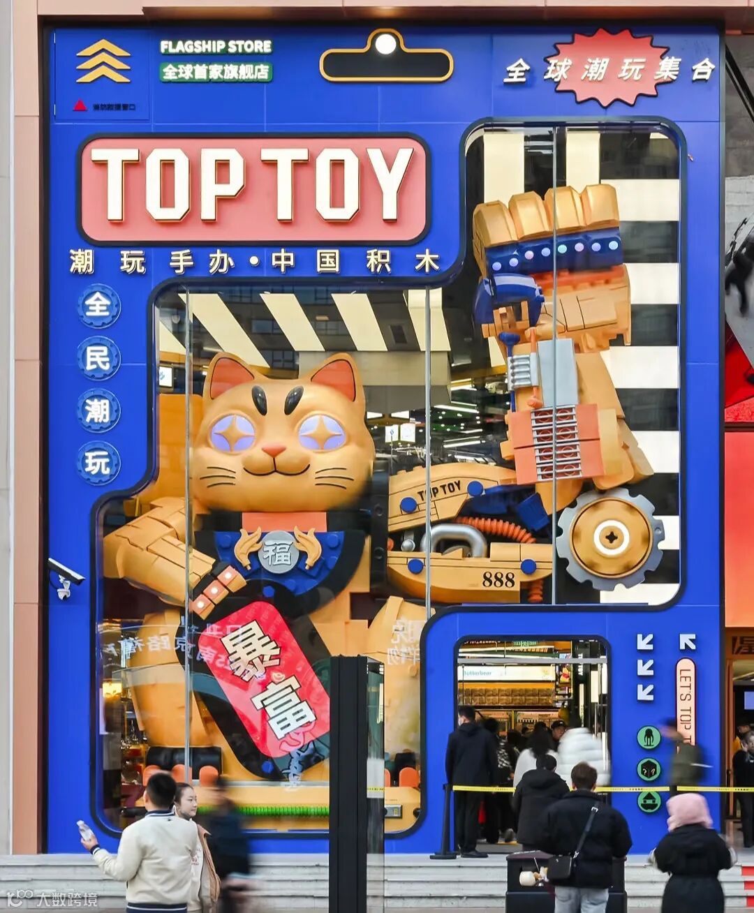TOP TOY南京东路旗舰店共有三层,面积约700平方米,门头橱窗内放置了一个巨型“大力招财猫”装置,这是由品牌原创设计的形象,已经成了一个吸引游客打卡的地标。
