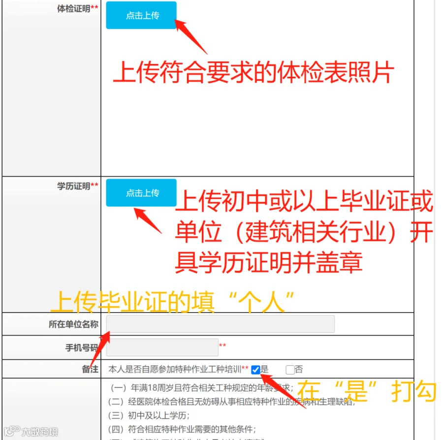 - 使用电脑登录“广东省建筑施工特种作业人员资格管理系统”上传报名资料(暂不支持手机端操作);