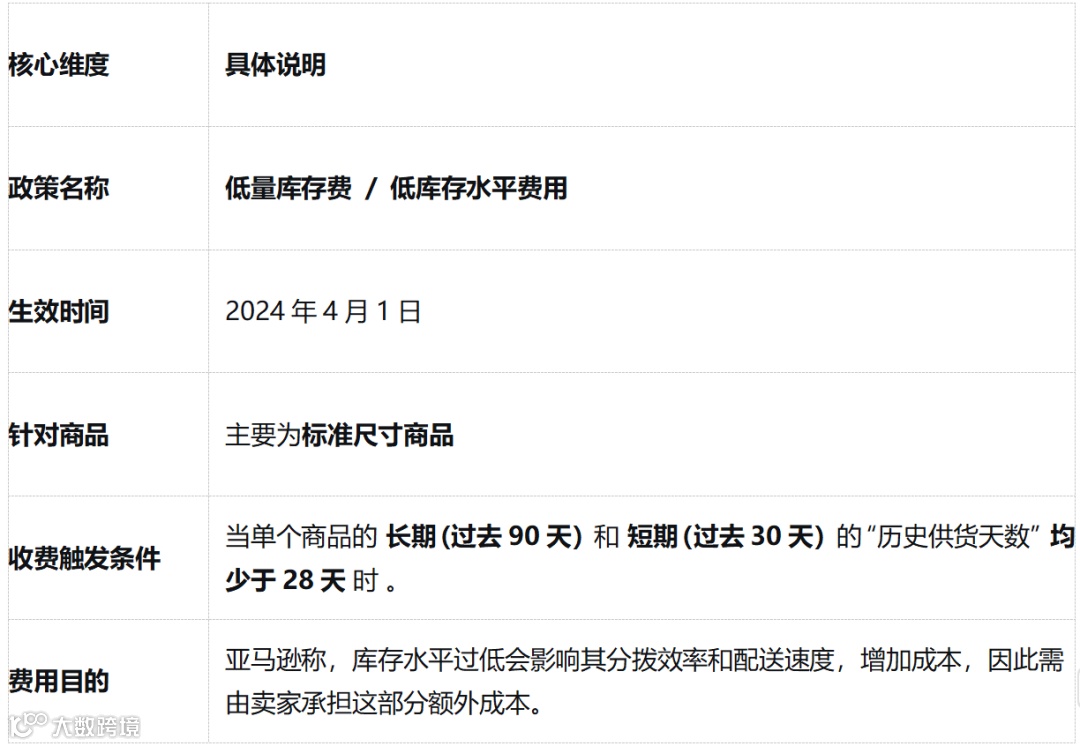 亚马逊分别统计商品过去30天(短期)和90天(长期)的历史供货天数;仅当两项均持续低于28天,才开始收取低库存水位费。