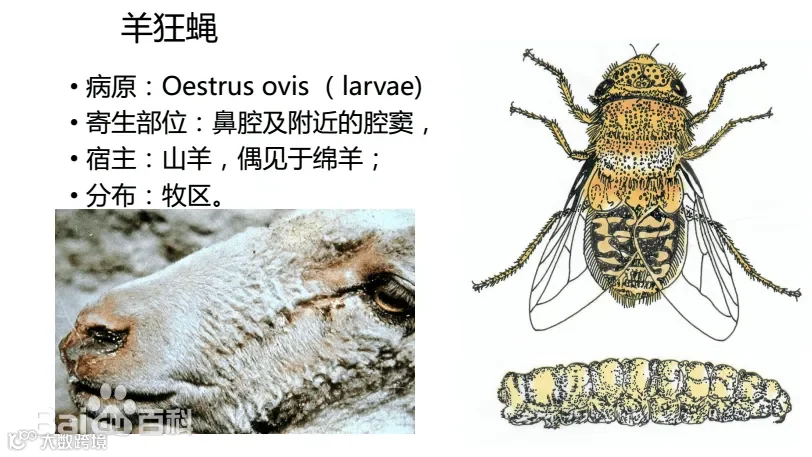 羊狂蝇(又名羊鼻蝇)属双翅目狂蝇科,可致羊狂蝇蛆病。雌蝇将幼虫产于羊鼻孔周围,幼虫钻入鼻腔发育,引发羊只频繁摇头、喷鼻、抵地或藏头于他羊腹下,严重干扰采食与休息,导致发育不良、消瘦;重度感染可致鼻道堵塞、呼吸困难。