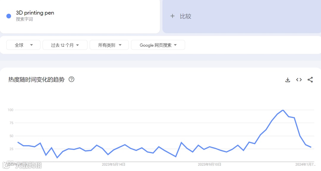 根据谷歌趋势数据显示,近12个月,“3D printing pen”(3D打印笔)一词搜索热度持续在25—100之间,新西兰、阿拉伯联合酋长国、澳大利亚、爱尔兰、英国等国占主要搜索份额。