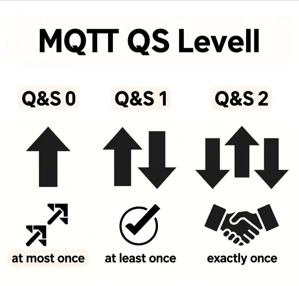 总结:QoS等级从低到高(0→2),可靠性提升但复杂度增加,需根据实际场景权衡选择。