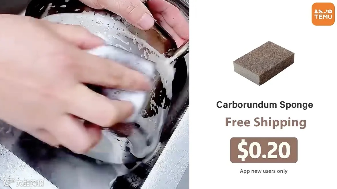 广告产品Carborundum Sponge(金刚砂海绵)本身就比较特别,它的外形和功能都跟常规款的黄色清洁海绵有非常大的区别,用静态图在右侧持续展示,引发观众好奇,同时在左侧用视频详细展示其使用奇效,吸引用户继续观看。