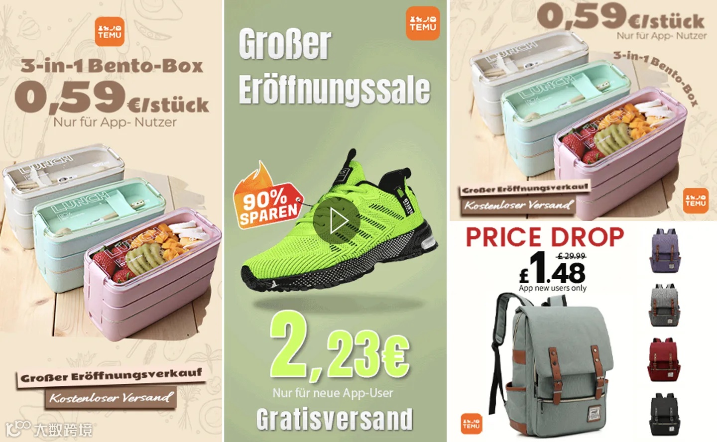 Temu引流策略这样的排布方式背后是一套对消费者行为路径的引导:让他们看到广告时最先注意到商品,判断商品是否需要,再引导看价格,很容易被极低的价格和包邮信息吸引,产生下一步的点击行为。