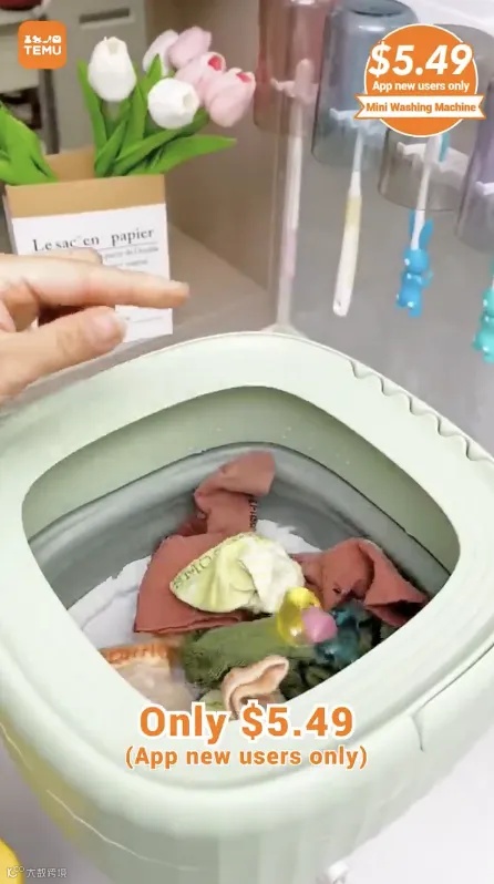 另一则投放时间较长的迷你洗衣机广告,素材时长18秒,开头介绍产品名称和价格,然后展示使用过程,最后是用完后的收纳。广告文案用“有效清洗个人或婴儿用品,节省时间和精力”再次强调迷你洗衣机与常规洗衣机的差异化卖点。