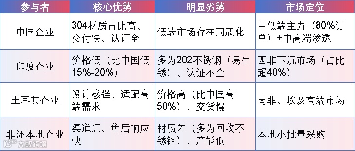 当前非洲市场主要有四类参与者,但中国企业的优势清晰可见:在“比印度产品耐用、比土耳其产品便宜、比本地产品产能足”的三角平衡中占据最佳位置。