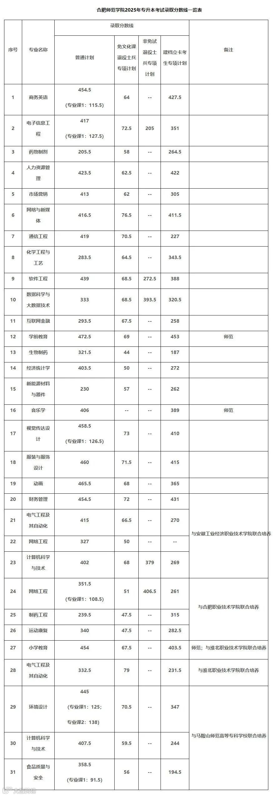 我校2025年普通高校专升本考试工作已经结束,招生计划已全部完成,不再接收校外调剂。根据《合肥大学2025年普通高校专升本招生章程》规定,确定录取分数线。现将我校各专业、各类别计划录取最低分公布如下: