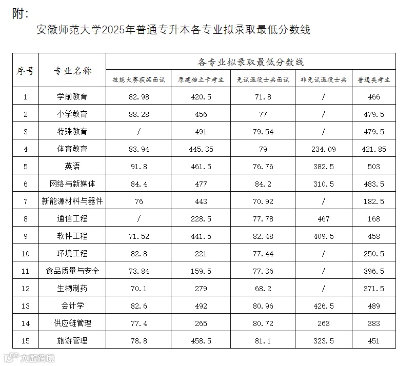 你们好!根据《滁州学院2025年普通高校专升本招生章程》相关规定,我校进行了校内计划调剂,所有招生计划已完成,不进行校外调剂。现将分专业分计划类别的拟录取分数线公布如下: