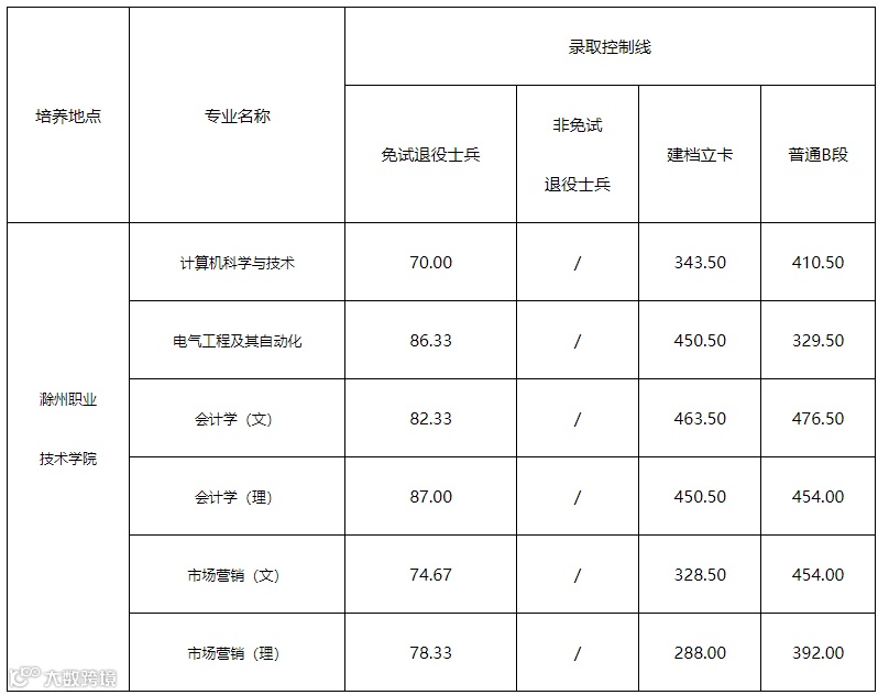 拟录取60人,其中A段免试退役士兵专项计划拟录取4人,已包括所有合格考生;非免试退役士兵专项计划拟录取1人,已包括所有合格考生;建档立卡考生专项计划拟录取4人,已包括所有合格考生;B段拟录取51人,从高分到低分依次录取合格考生,录取分数线为455.5分。