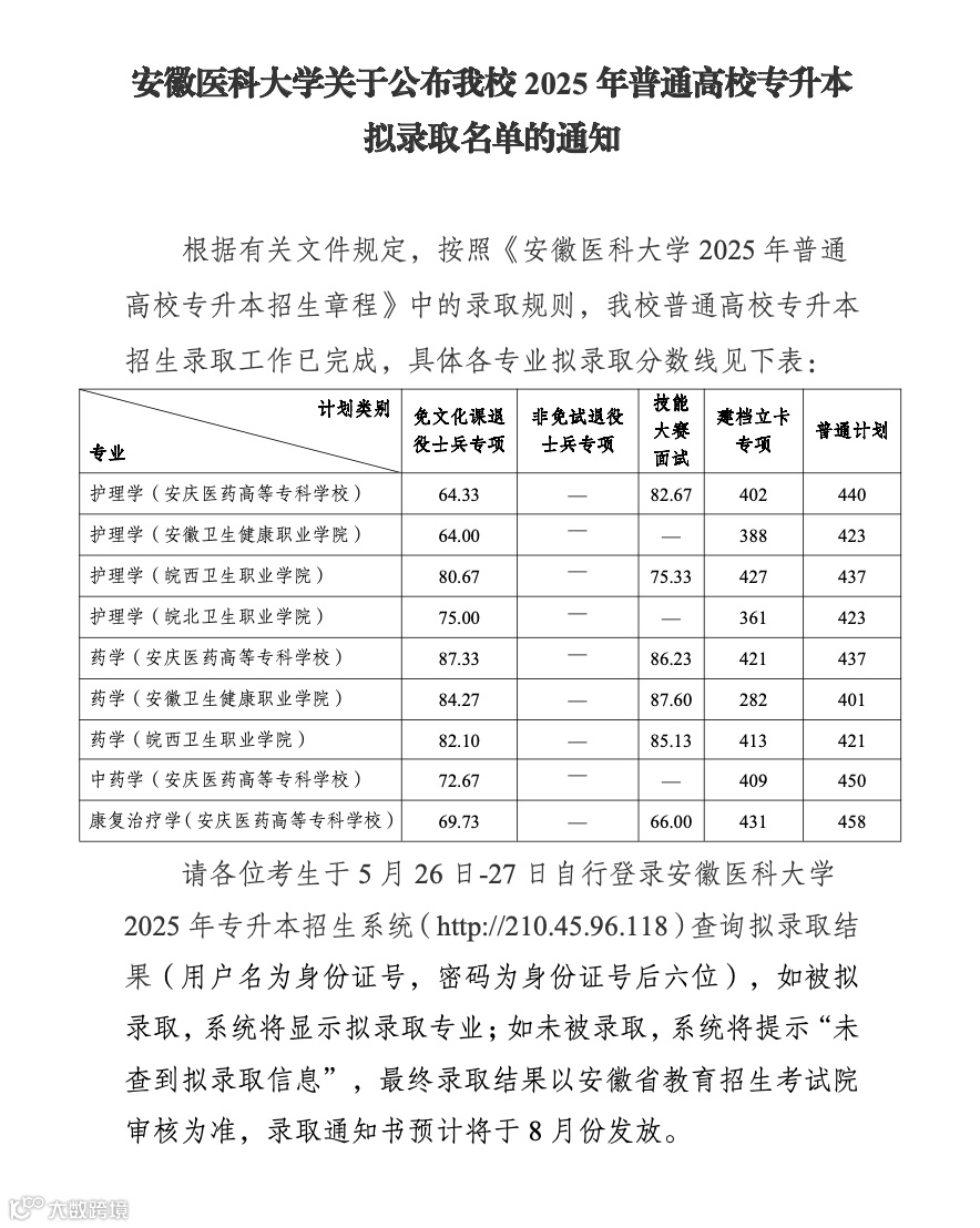 2. 专升本预录取考生可在本科招生信息网录取查询(http://app.ahau.edu.cn/recruit/public/zscx.jsp)查询录取结果,最终录取结果以安徽省教育招生考试院审核反馈数据为准。