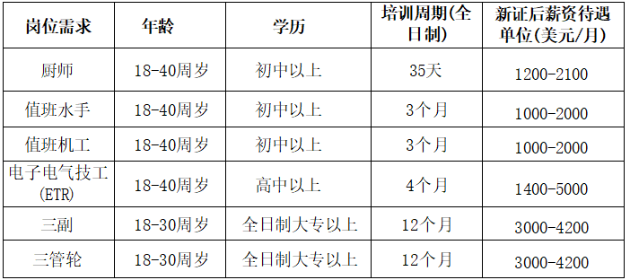 1.以上工资均为每月基本工资(美元),不包括加班费、劳务费、伙食补贴、出海补贴、社保、商业保险等;