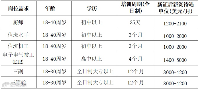 2.船上提供食宿和生活用品,伙食费按国际标准每月为300—400美元;