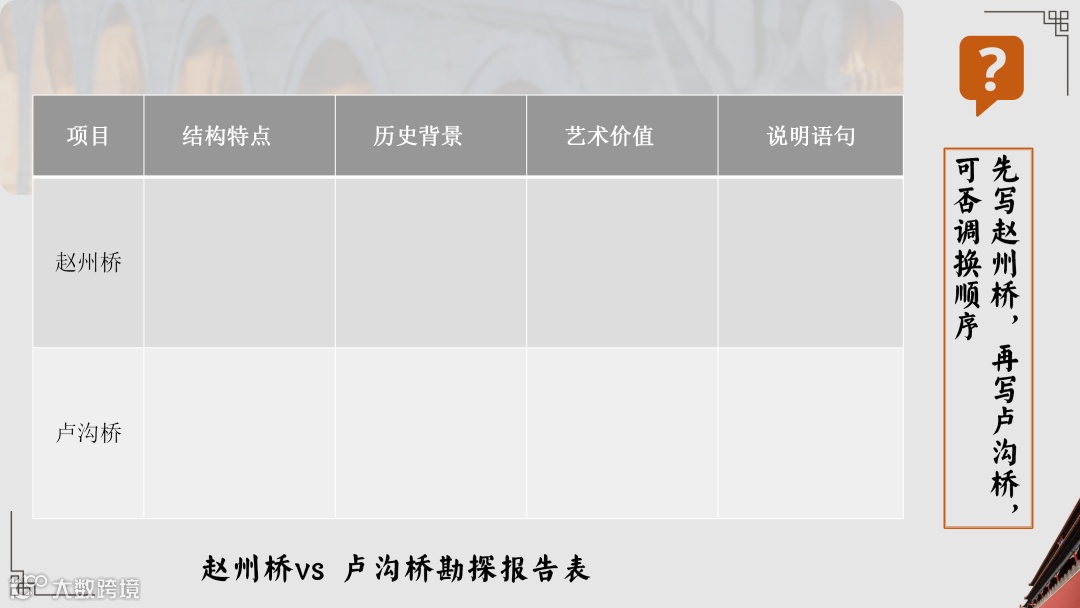 ① 限制词擂台:聚焦“大约建成于公元282年”“可能是有记载的最早的石拱桥了”,开展辩论:“‘大约’‘可能’能否删去?”