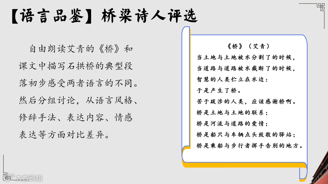 ③审美拓展:自由朗读艾青的《桥》和课文中描写石拱桥的典型段落初步感受两者语言的不同。然后分组讨论,从语言风格、修辞手法、表达内容、情感表达等方面对比差异。