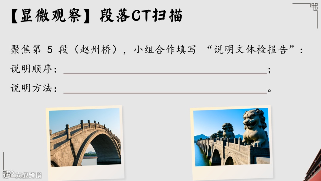 ① 聚焦第 5 段(赵州桥),小组合作填写“说明文体检报告”: