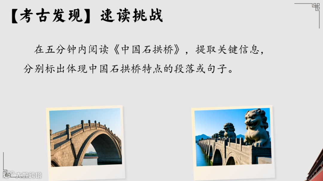 【设计意图】训练速读提取信息能力,初步感知石拱桥特点。