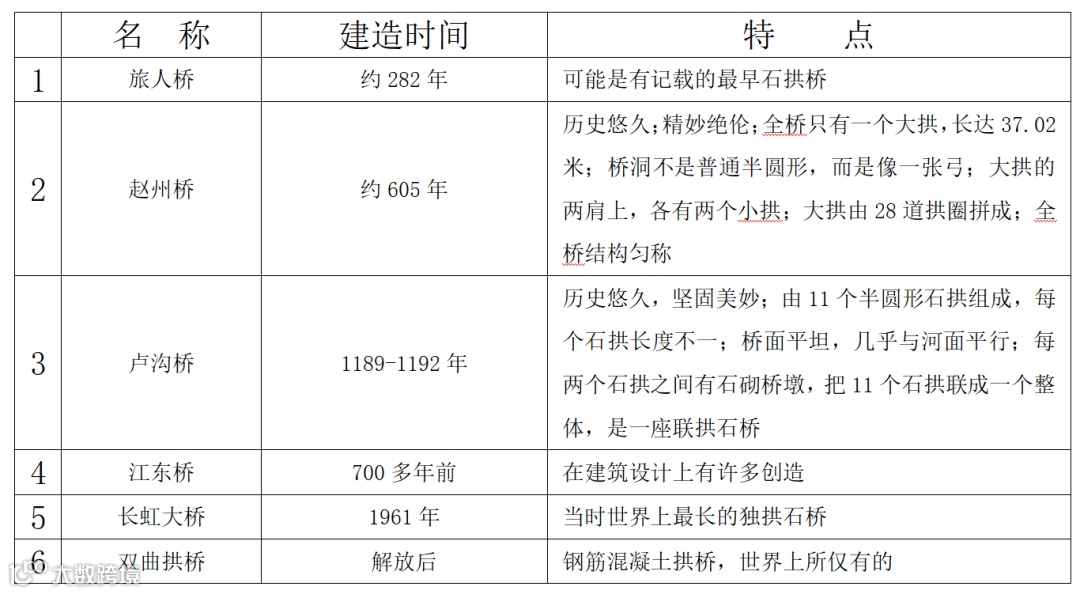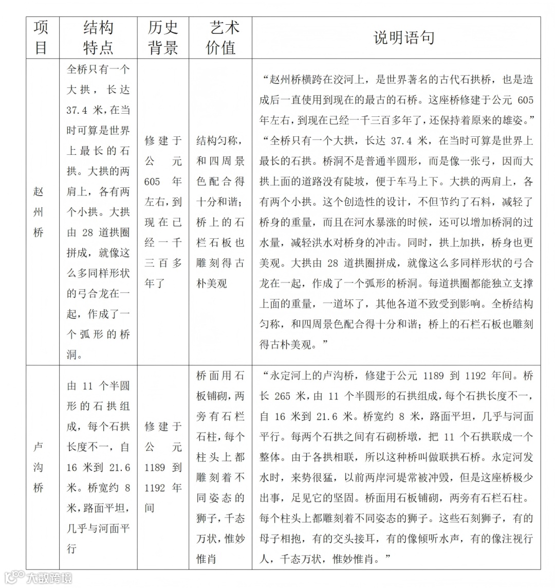 历史悠久:“我国的石拱桥有悠久的历史。《水经注》里提到的‘旅人桥’,大约建成于公元 282 年,可能是有记载的最早的石拱桥了”“赵州桥修建于公元 605 年左右,到现在已经一千三百多年了” 等内容。