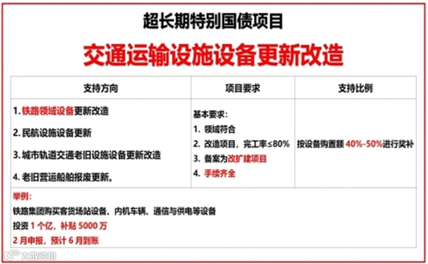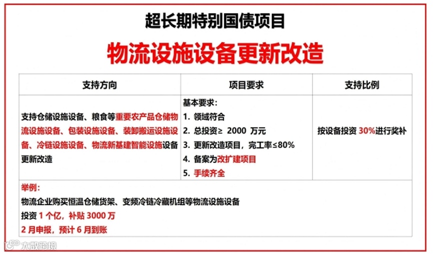 超长期特别国债(“两新”)共支持15个方向,其中明确纳入物流领域的有两项:物流设施设备更新改造和交通运输设施设备更新改造。