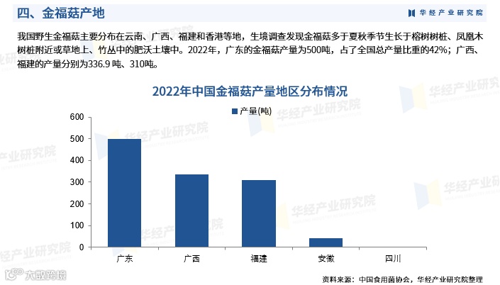 2022年,广东金福菇产量达500吨,占全国总量的42%;广西、福建分别产出336.9吨和310吨,位居前列。