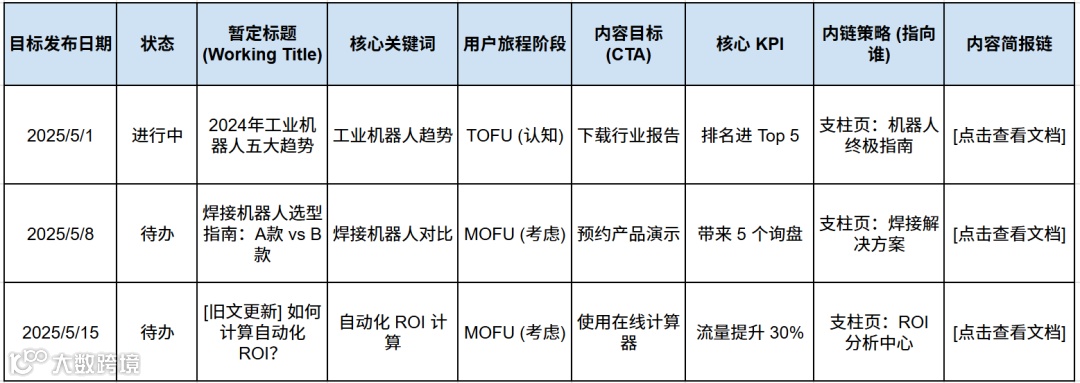 • 暂定标题(Working Title) • 核心关键词(Primary Keyword):主攻排名的目标词 • 用户旅程阶段(Funnel Stage):TOFU / MOFU / BOFU • 目标受众(Target Persona):明确读者身份 • 内容目标/CTA(Goal & Call-to-Action):引导下载、咨询或跳转阅读 • 🎯 核心 KPI(Key Metric):如“排名进入首页”或“带来 10 个线索” • 💡 内链策略(Internal Link Strategy):提前规划链接至哪个“支柱页”,提升结构权重 • 📄 内容简报链(Content Brief Link):协作文档链接,包含大纲、SEO 要求、竞品分析,作为“施工图纸”