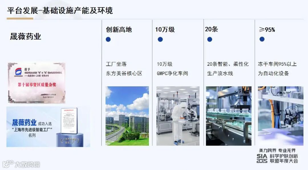 在生产智造层面,其全资子公司晟薇药业坐落于东方美谷核心区,拥有10万级GMPC净化车间,20条智能、柔性化生产流水线,冻干车间自动化设备达到95%以上。过硬的生产条件,使晟薇药业成功入选“上海市先进级智能工厂”。