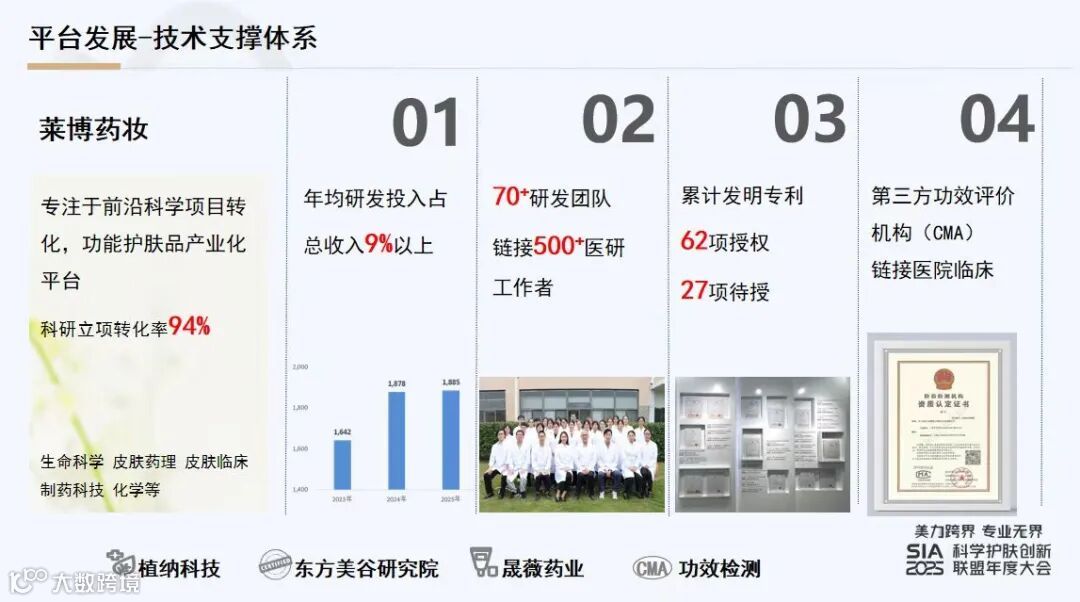 在研发创新层面,凭借植纳生物科技、东方美谷功能护肤品研究院在前端的发力,其科研立项转化率达到94%,年均研发投入占比超9%,研发人员达70+,累计发明专利62项授权,27项待授。并与第三方功效评价机构(CMA)建立深度合作,链接医院临床。