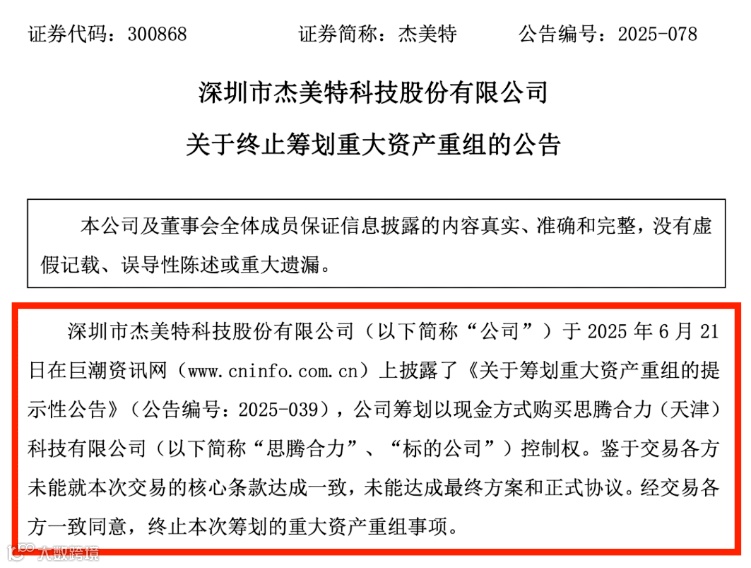 但历经近半年协商,交易各方始终未能就核心条款达成一致,最终在未签署正式文件、无违约责任的情况下终止重组,杰美特同时承诺一个月内不再筹划同类事项。