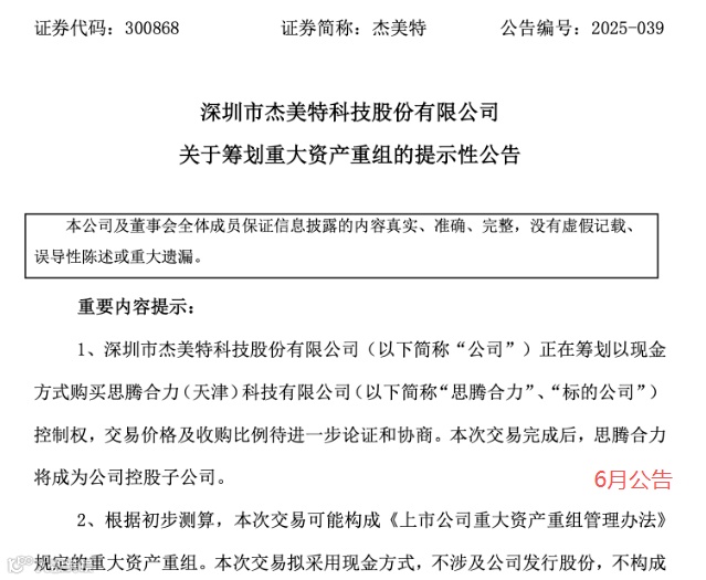 从事件脉络来看,杰美特的重组计划始于今年6月,彼时公司公布筹划重大资产重组,拟以现金收购方式拿下思腾合力(天津)科技有限公司控制权,试图跨界拓展进入算力服务器、AI管理软件及云计算业务。