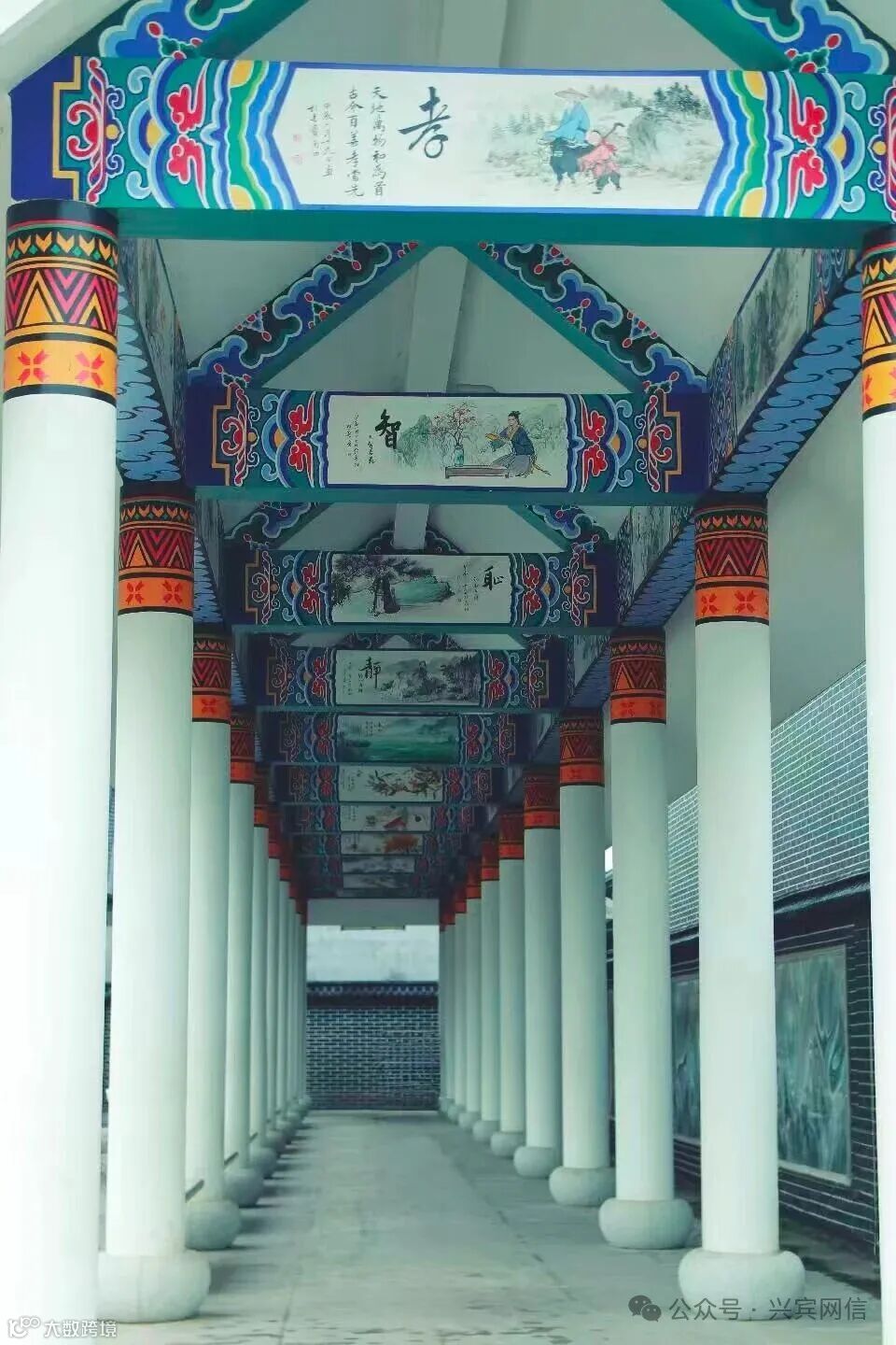 南泗传统文化长廊活动中心项目位于南泗河道旁,长廊主要包含三部分:一是民族团结广场,广场及周围设置了多处民族团结元素,是各民族交流融合、感受民族团结氛围的场所;二是传统文化长廊,内容有南泗山水景点画、仁义礼智信故事、二十四节气等,彰显了民族文化的多元与共融;三是民族团结陈列馆,目前仍在建设中,拟以弘扬民族一家亲为主题,通过图文并茂的形式展现各民族大团结。