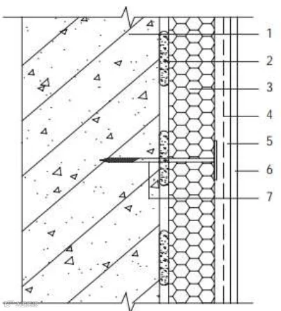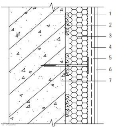 1-基层;2-胶粘剂;3-EPS板;4-玻纤网;5-薄抹灰面层;6-饰面涂层;7-锚栓