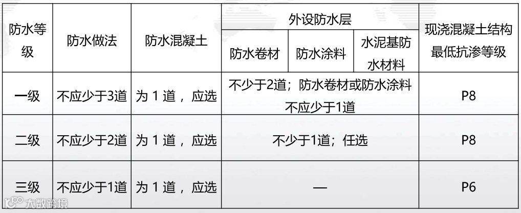 - 建筑地下工程防水分为甲、乙、丙三类,防水等级共三级;