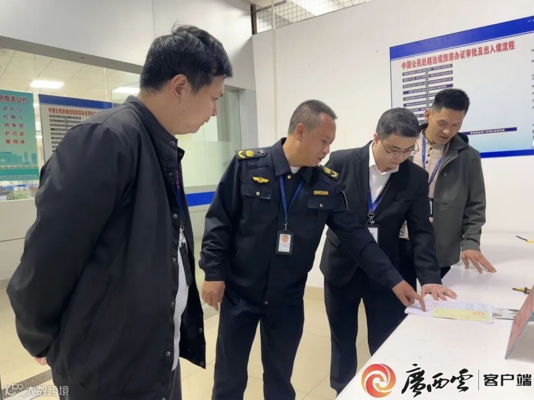 东兴市纪委监委干部在出入境办证大厅了解有关情况。