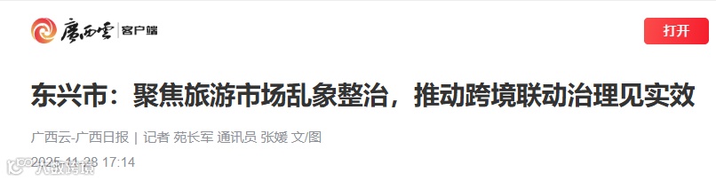 持续整治换来了显著成效。2025年以来,东兴国门景区接待游客362万余人次,投诉率同比下降33.2%,游客满意度显著提升。如今的东兴边境旅游市场,秩序更加规范有序,跨境旅游团队服务质量稳步提高,未发生“脱团”等违规现象,实现了旅游市场秩序与经济效益的双提升,为中越边境旅游高质量发展注入了强劲动力。(记者 苑长军 通讯员 张媛 文/图)