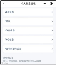 注册成功后系统将自动跳转到“个人信息管理”页面。考生需要先完成上传基本照片、添加学历、学位信息、账号绑定与关注,才能进行后续报名操作。